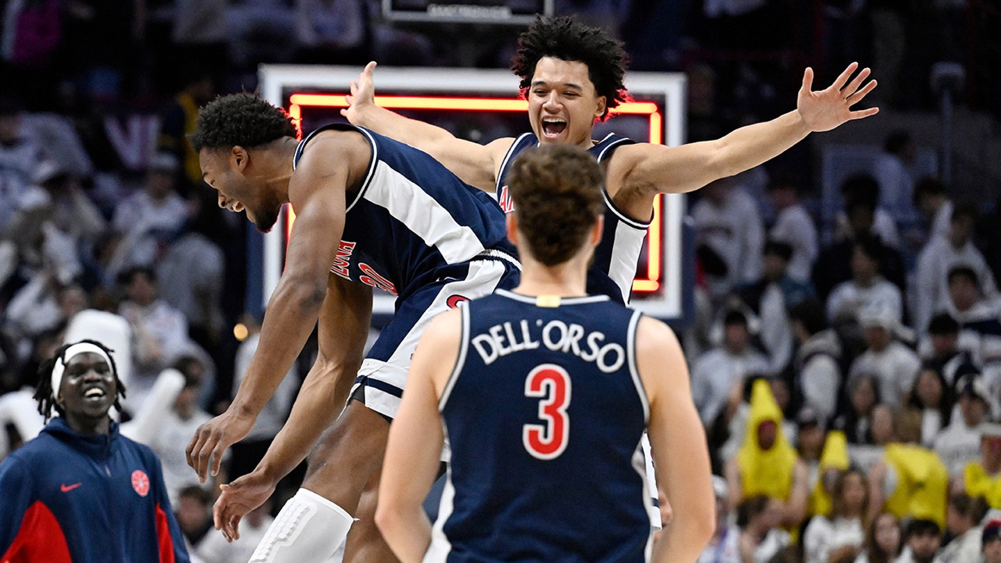 Arizona guard Brayden Burries raises his arms in celebration with Arizona forward Tobe Awaka, left, and Arizona guard Anthony Dell’Orso late in the first half of an NCAA college basketball game against UConn in Storrs, Conn., Nov. 19, 2025. (Jessica Hill/AP Photo)
