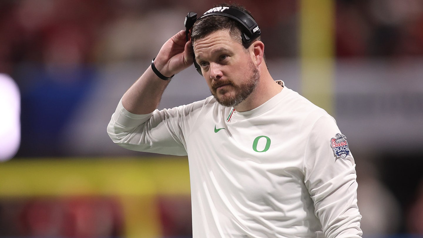 Oregon Ducks head coach Dan Lanning reacts during the first half of the 2025 Peach Bowl and College Football Playoff semifinal game against the Indiana Hoosiers at Mercedes-Benz Stadium on January 9, 2026. (Brett Davis/Imagn Images)