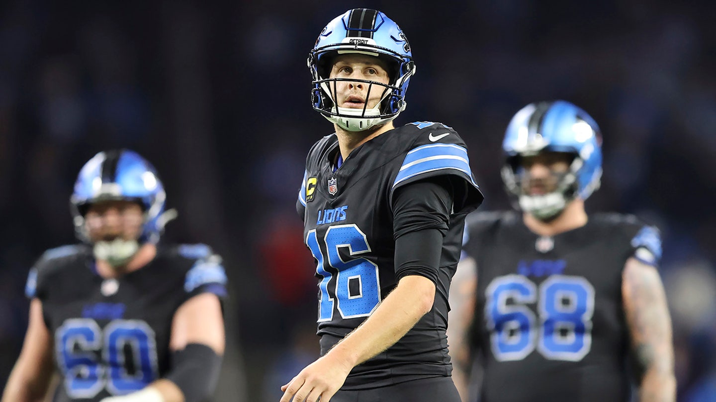 The quarter of the Detroit Lions, Jared Goff (16) reacts in front of goalkeeper Graham Glasgow (60) and the offensive platform Taylor Decker (68) during the second half of a match against the Buffalo Bills on December 15, 2024, in Detroit. )
