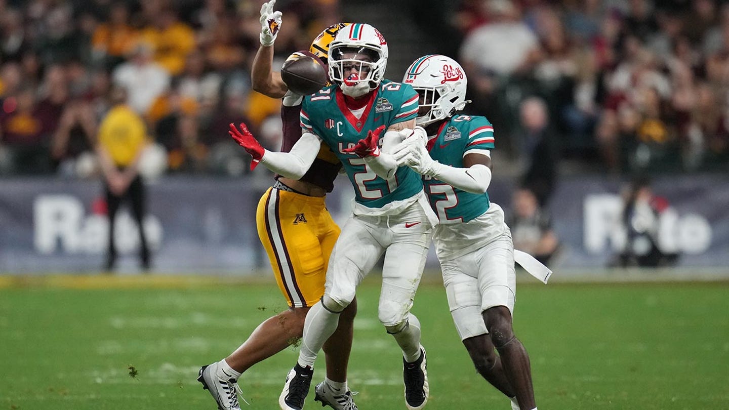 New Mexico safety Austin Brawley drives the ball away from Minnesota wide receiver Jalen Smith in the first half of an NCAA Rate Bowl college football game Friday, Dec. 26, 2025, in Phoenix. (AP Photo/Rick Scuteri)