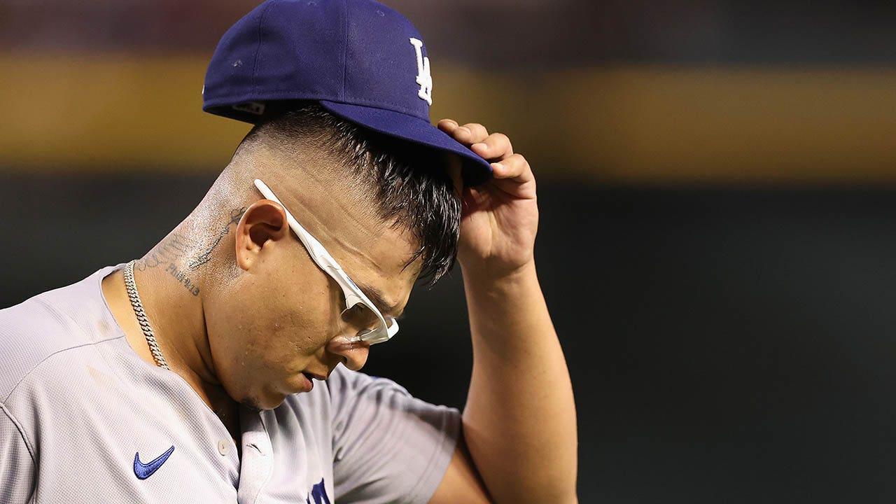 The launcher leaving Julio Urías of the Los Angeles Dodgers reacts after launching the sixth round of an MLB match against the Arizona Diamondbacks in Chase Field on August 8, 2023, in Phoenix, Ariz. (Christian Petersen / Getty Images)