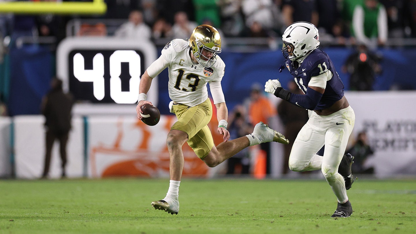 Notre-Dame Fighting Irish The quarter-Arrière Riley Leonard (13) directs the ball, under pressure by the defender of Penn Stateny Lions Abdul Carter (11) in the second half of the Orange Bowl at the Hard Rock stadium. (Nathan Ray Seebeck-Imagn images)