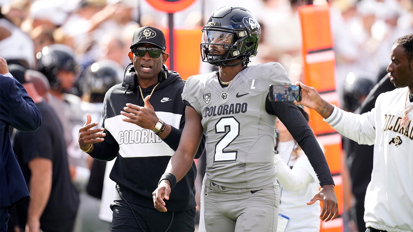 The Colorado head coach, Deion Sanders, on the left, speaks with his son, the quarter-Arrière Sheder Sanders, before a match against southern California on September 30, 2023, in Boulder, Colo. (AP photo / David Zalubowski)