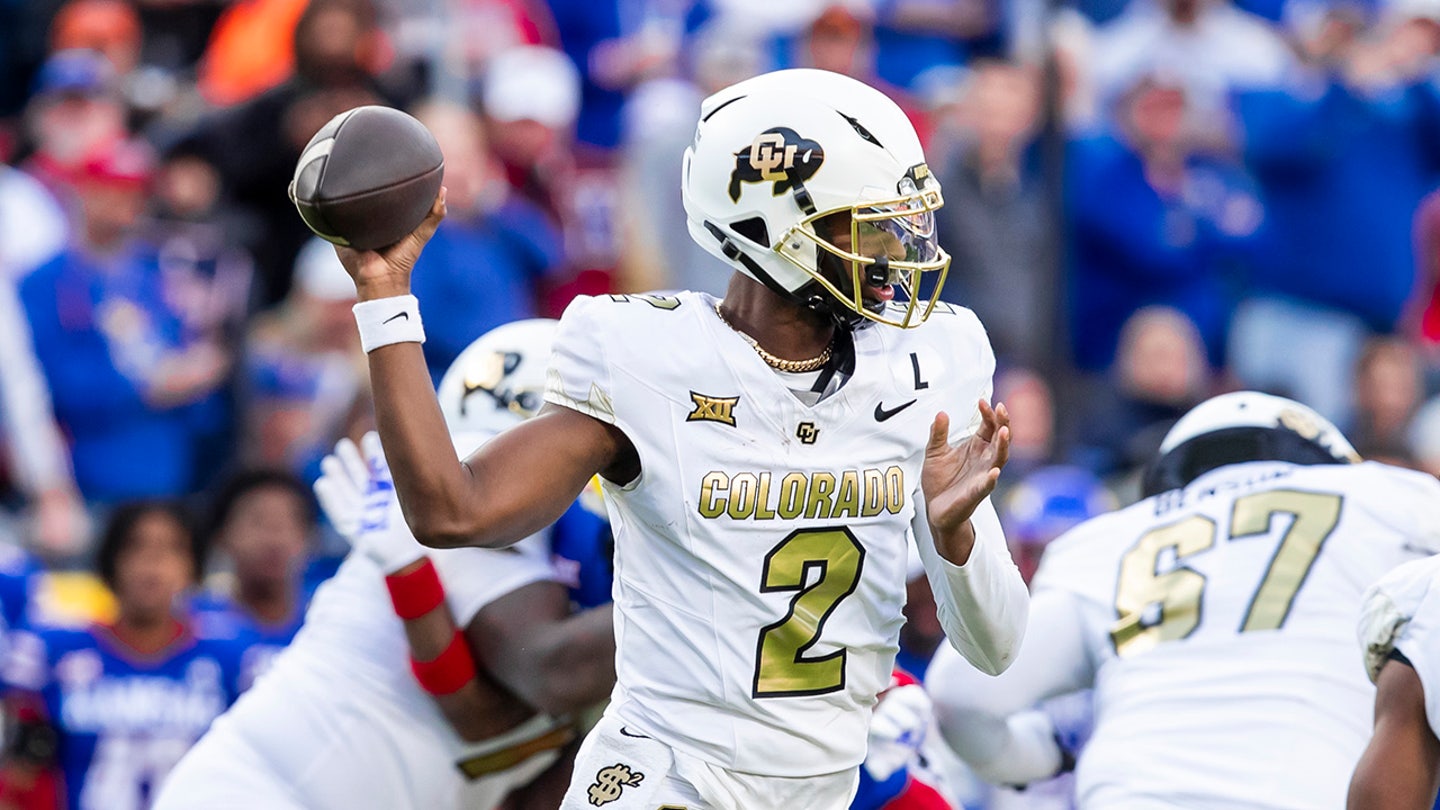 The quarter-arre of Colorado Shemer Sanders passes against Kansas Jayhawks and Geha Field at the Arrowhead stadium. (Images of Nick Tre. Smith-Imagn)