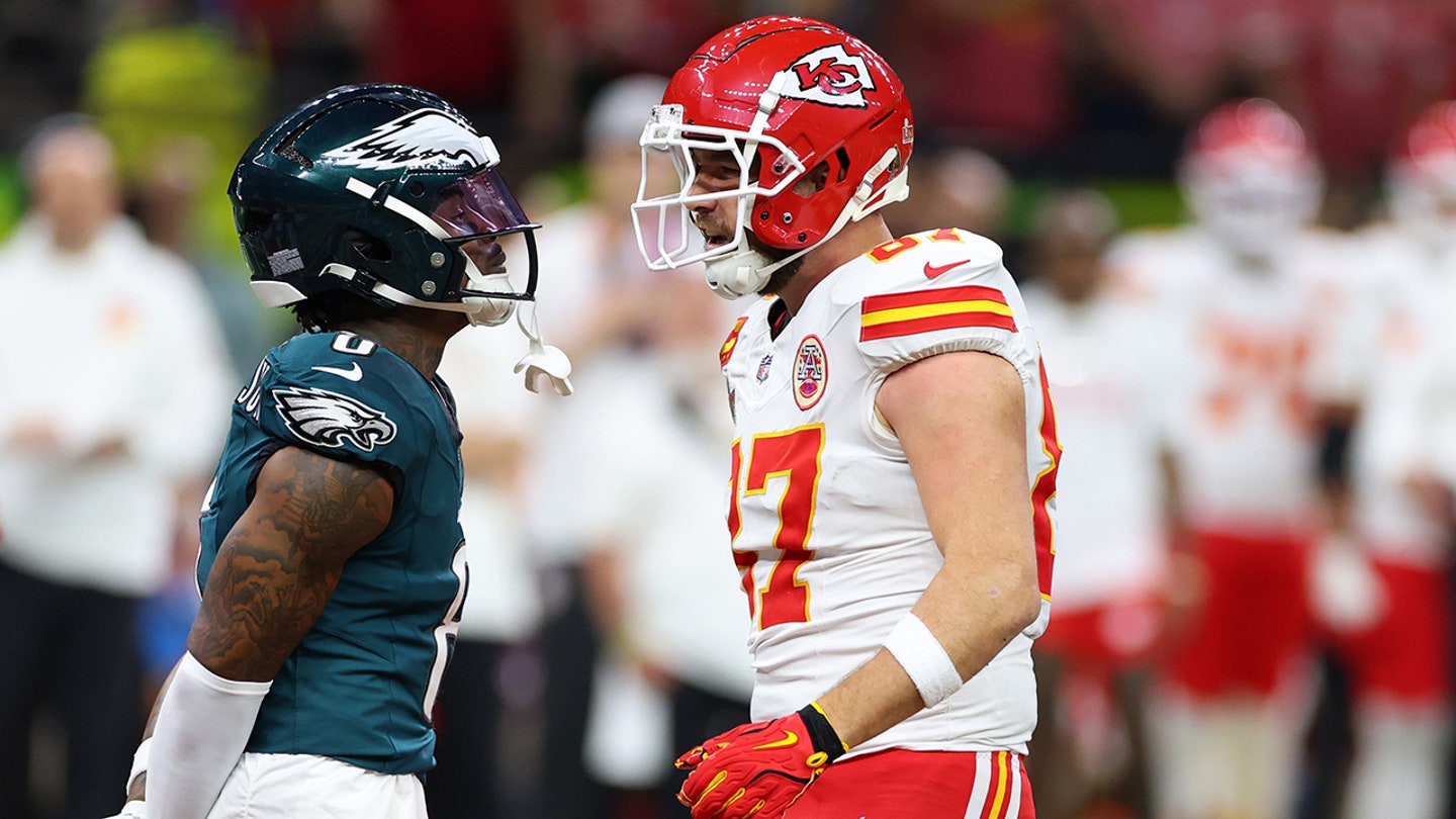 CJ Gardner-Johnson, n ° 8 of the Eagles of Philadelphia, and Travis Kelce, n ° 87 of the Chiefs of Kansas City, face the first quarter during the Super Bowl Lix in Caesars Superdome on February 9, 2025 in New Orleans. (Gregory Shamus / Getty Images)