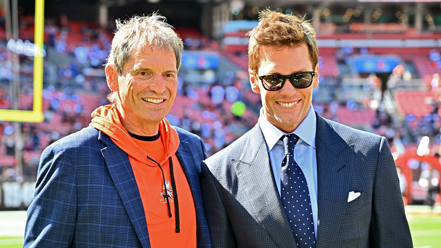 Former Cleveland Browns quarterback Bernie Kosar (left) and broadcaster and former NFL quarterback Tom Brady stand on the field before a game between the Dallas Cowboys and the Cleveland Browns at Cleveland Browns Stadium in Cleveland, Ohio on September 8, 2024. (Jason Miller/Getty Images)