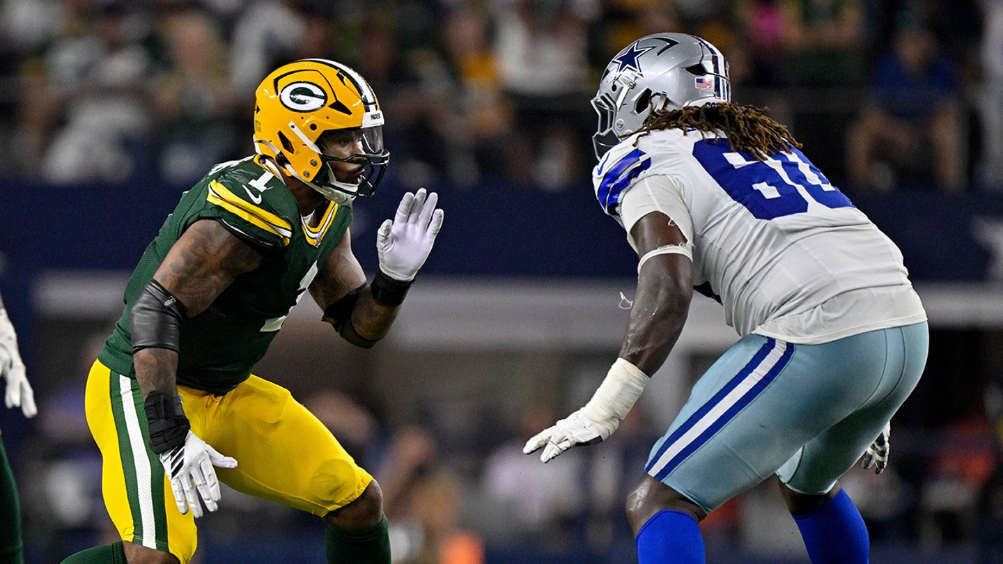 Dallas Cowboys offensive tackle Tyler Guyton (60) returns to block Green Bay Packers defensive end Micah Parsons (1) during the game between the Dallas Cowboys and the Green Bay Packers at AT&T Stadium in Arlington, Texas on September 28, 2025. (Jérôme Miron/Imagn Images)