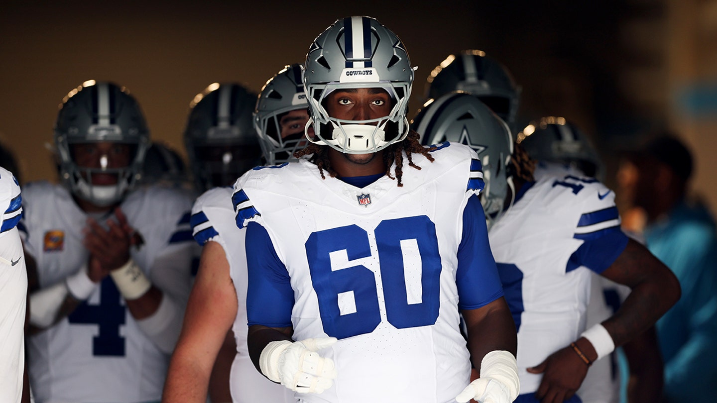 Dallas Cowboys offensive tackle Tyler Guyton (60) prepares to take the field before the game against the Carolina Panthers at Bank of America Stadium in Charlotte, North Carolina on October 12, 2025. (Cory Knowlton/Imagn Images)