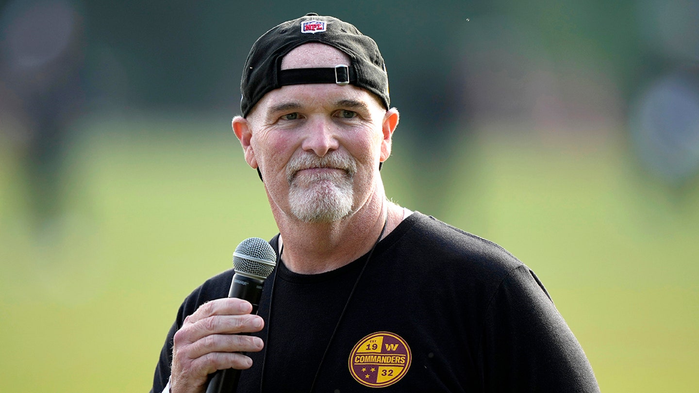 Washington commanding coach Dan Quinn speaks to fans during training at training camp on July 27, 2025 in Ashburn, Virginia. (AP photo / Mark Schiefelbein)