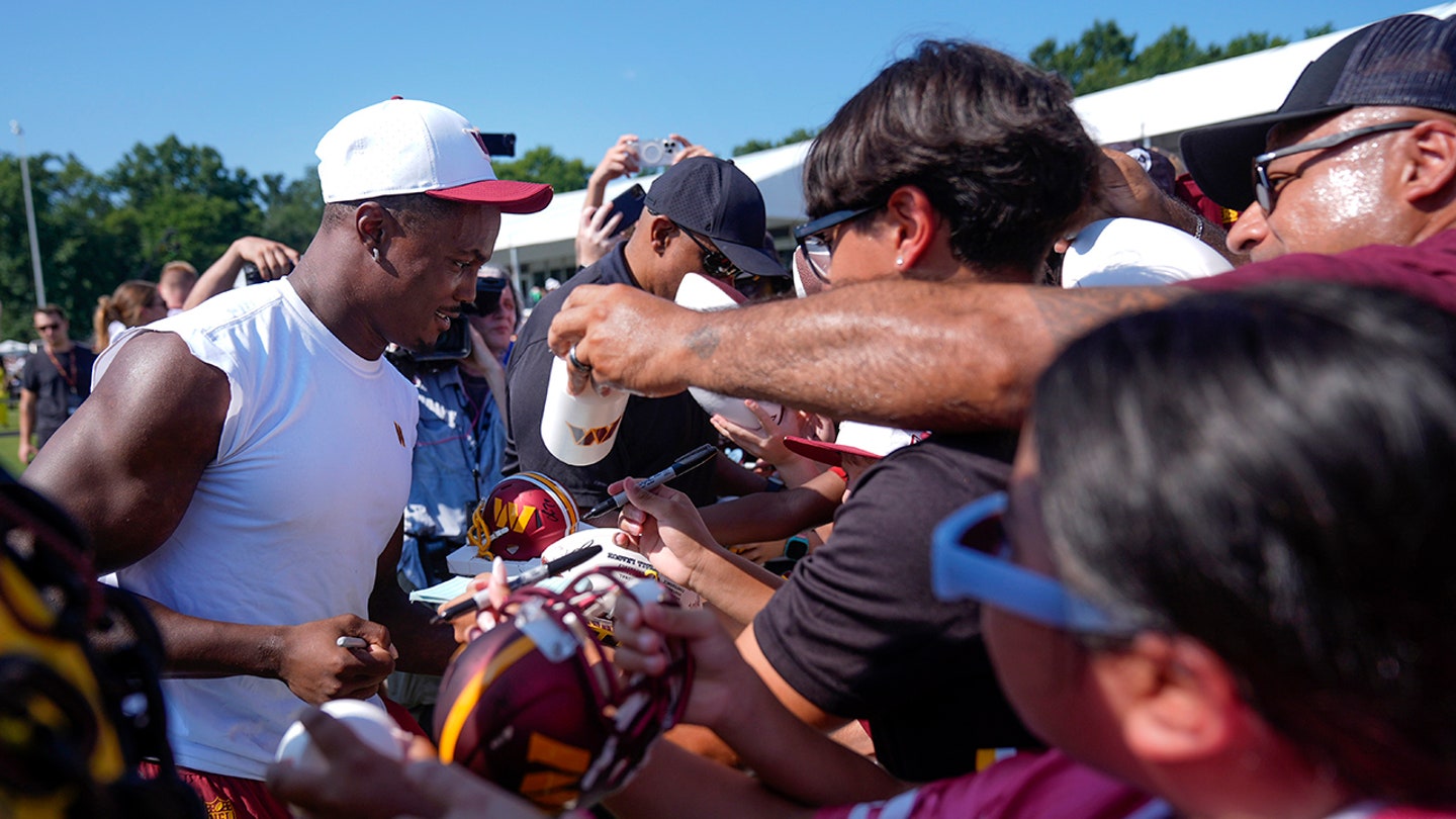 The receiver of Washington commanders, Terry McLaurin, signs autographs for fans after a practice at the team’s training camp on July 27, 2025, in Ashburn, Virginia. (AP photo / Mark Schiefelbein)