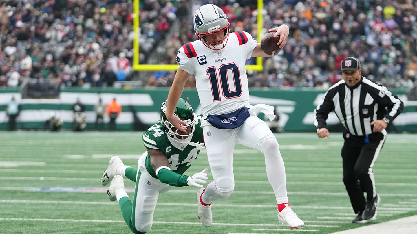 New England Patriots quarterback Drake Maye (10) is knocked out of bounds by New York Jets linebacker Jamien Sherwood (44) during the first half of an NFL football game, Sunday, Dec. 28, 2025, in East Rutherford, New Jersey. (AP Photo/Frank Franklin)