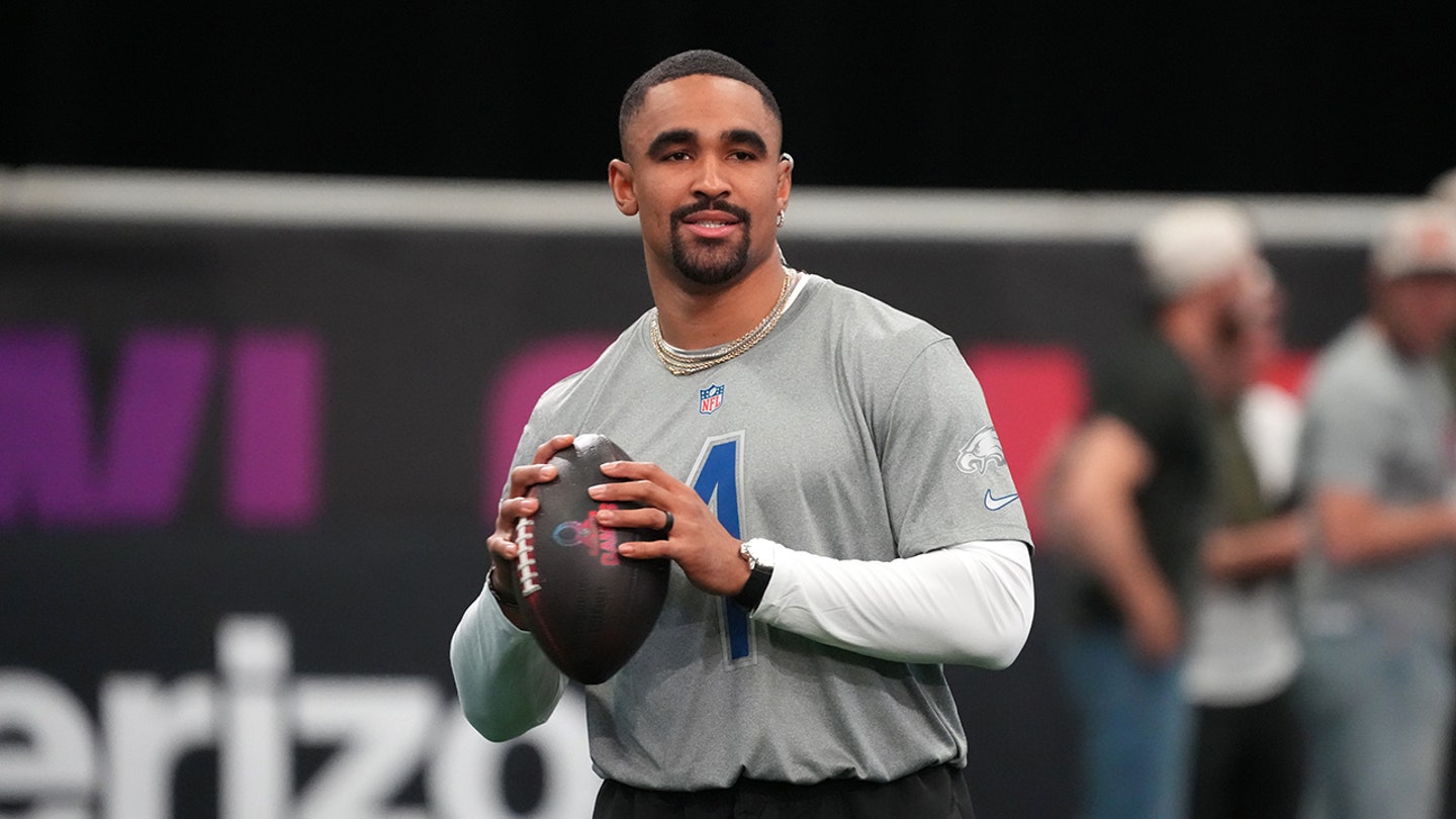 Philadelphia Eagles quarterback Jalen Hurts (1) during NFC practice at NFL Flag Fieldhouse in the Moscone Center South Building on February 2, 2026. (Kirby Lee/Imagn Images)