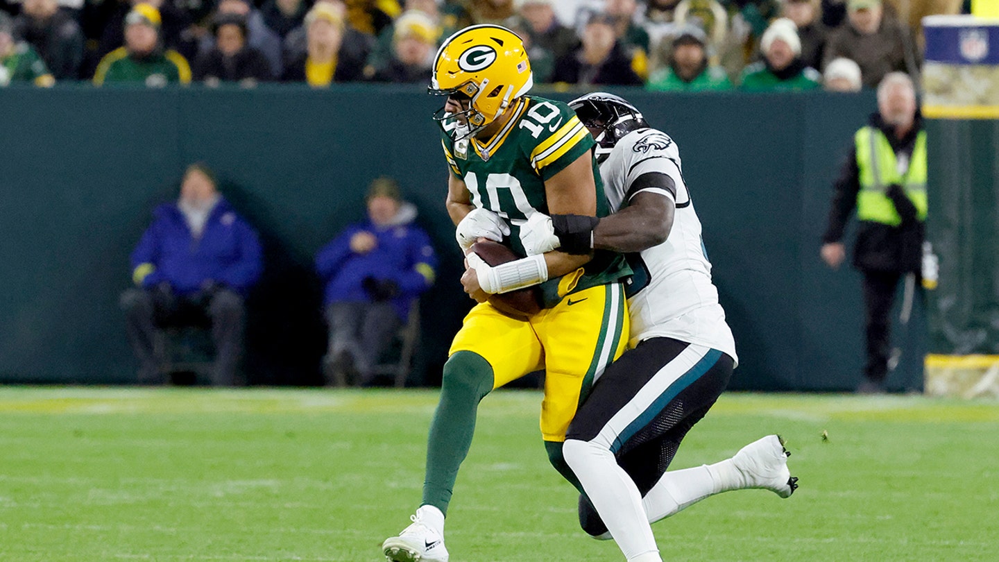 Philadelphia Eagles linebacker Jalyx Hunt (58) sacks Green Bay Packers quarterback Jordan Love (10) during the first half of an NFL football game in Green Bay, Wisconsin on November 10, 2025. (Mike Roemer/AP Photo)