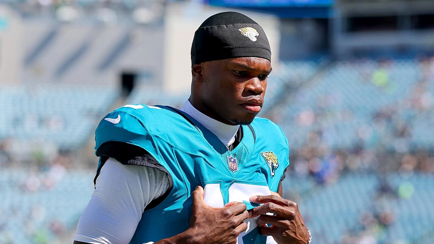 Travis Hunter of the Jacksonville Jaguars warms up before the game against the Seattle Seahawks at EverBank Stadium in Jacksonville, Florida on October 12, 2025. (Mike Carlson/Getty Images)