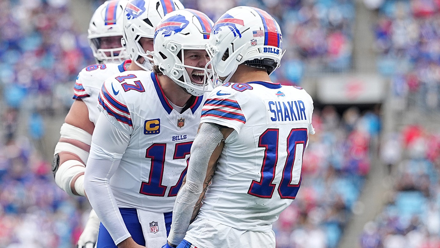 Khalil Shakir of the Buffalo Bills celebrates with Josh Allen after scoring a touchdown in the third quarter of the game against the Carolina Panthers at Bank of America Stadium on October 26, 2025 in Charlotte, North Carolina. (Matt Kelley/Getty Images)
