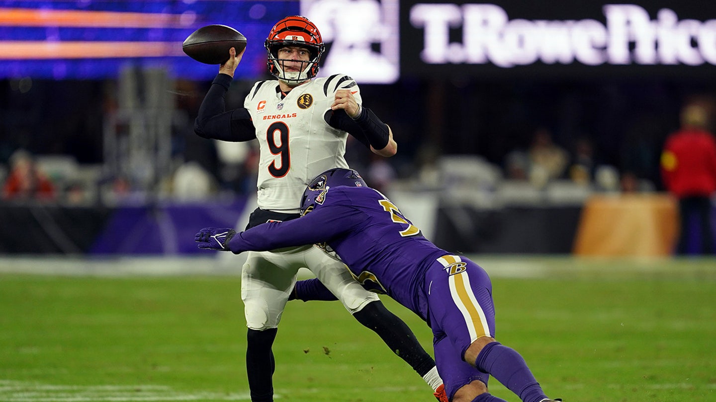 Cincinnati Bengals quarterback Joe Burrow (9) throws a pass against Baltimore Ravens linebacker Kyle Van Noy (53) during the second half at M&T Bank Stadium in Baltimore, Maryland on November 27, 2025. (Mitch Stringer/Imagn Images)
