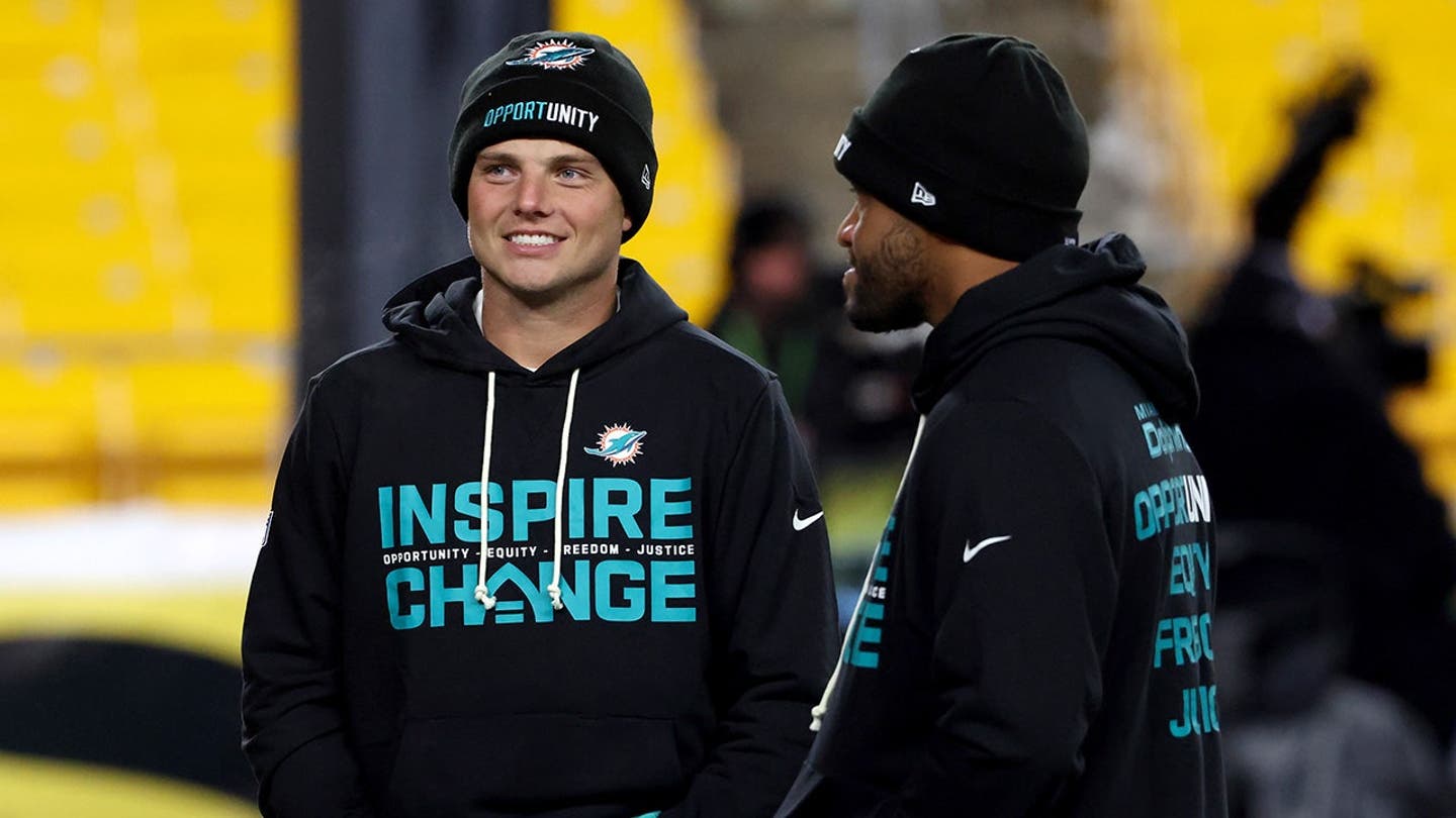 Miami Dolphins quarterbacks Zach Wilson and Tua Tagovailoa talk on the field before the game against the Pittsburgh Steelers at Acrisure Stadium in Pittsburgh, Pennsylvania on December 15, 2025. (Charles LeClaire/Imagn Images)