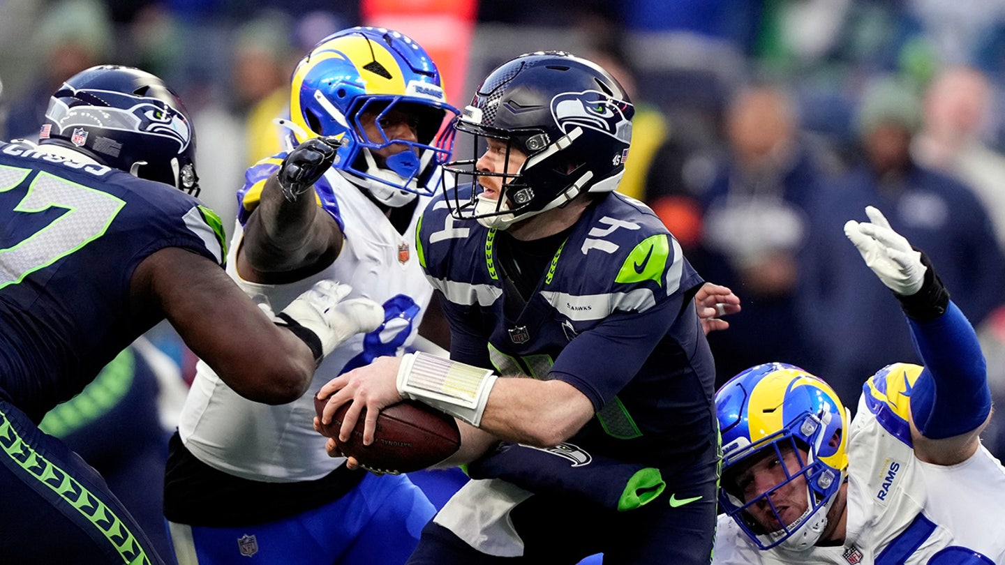 Seattle Seahawks quarterback Sam Darnold (14) is sacked by Los Angeles Rams defensive end Braden Fiske (55) during the first half of the NFC NFL Championship football game Sunday, Jan. 25, 2026, in Seattle. (AP Photo/Stephen Brashear)
