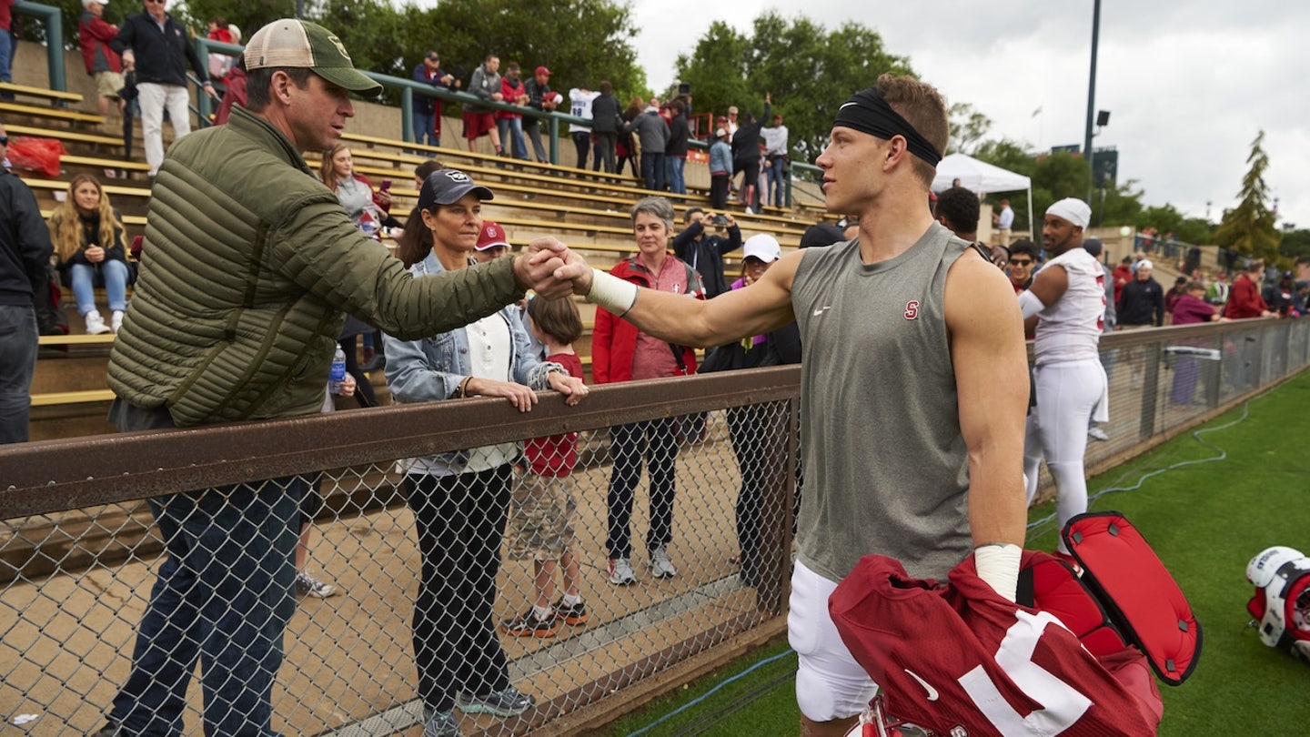 Christian McCaffrey of Stanford (5) shakes his hand with his father, the former receiver of the NFL Ed McCaffrey, while his mother Lisa looks at him after a spring match at the Cagan stadium. (John W. McDonough / Sports Illustrated / Getty Images)