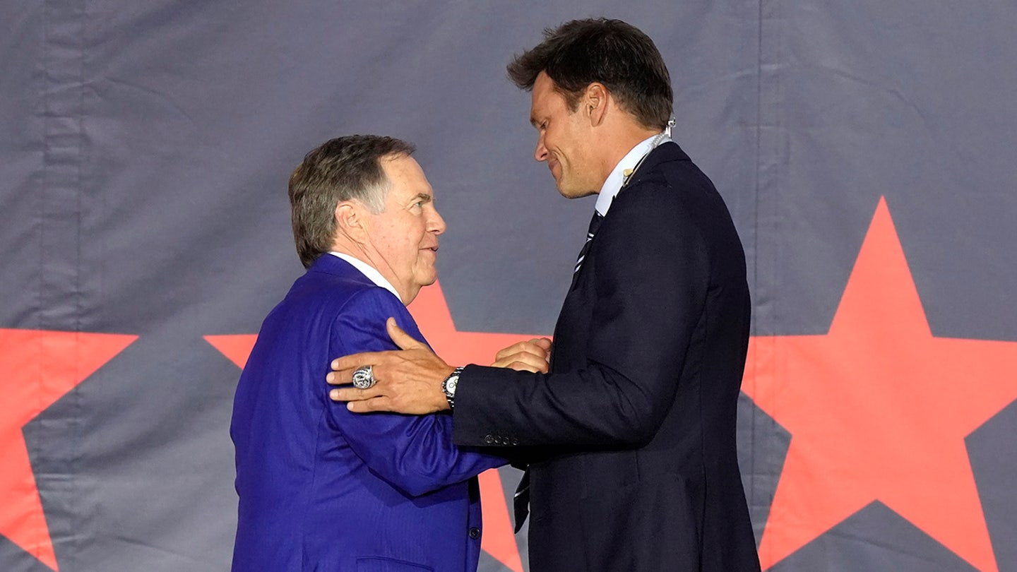 Tom Brady greets Bill Belichick on stage during the enthronement ceremonies of the Patriots’ renown temple for the ancient quarter of the Gillette Stadium, on June 12, 2024, in Foxborough, Massachusetts. (AP photo / Steven Senne)