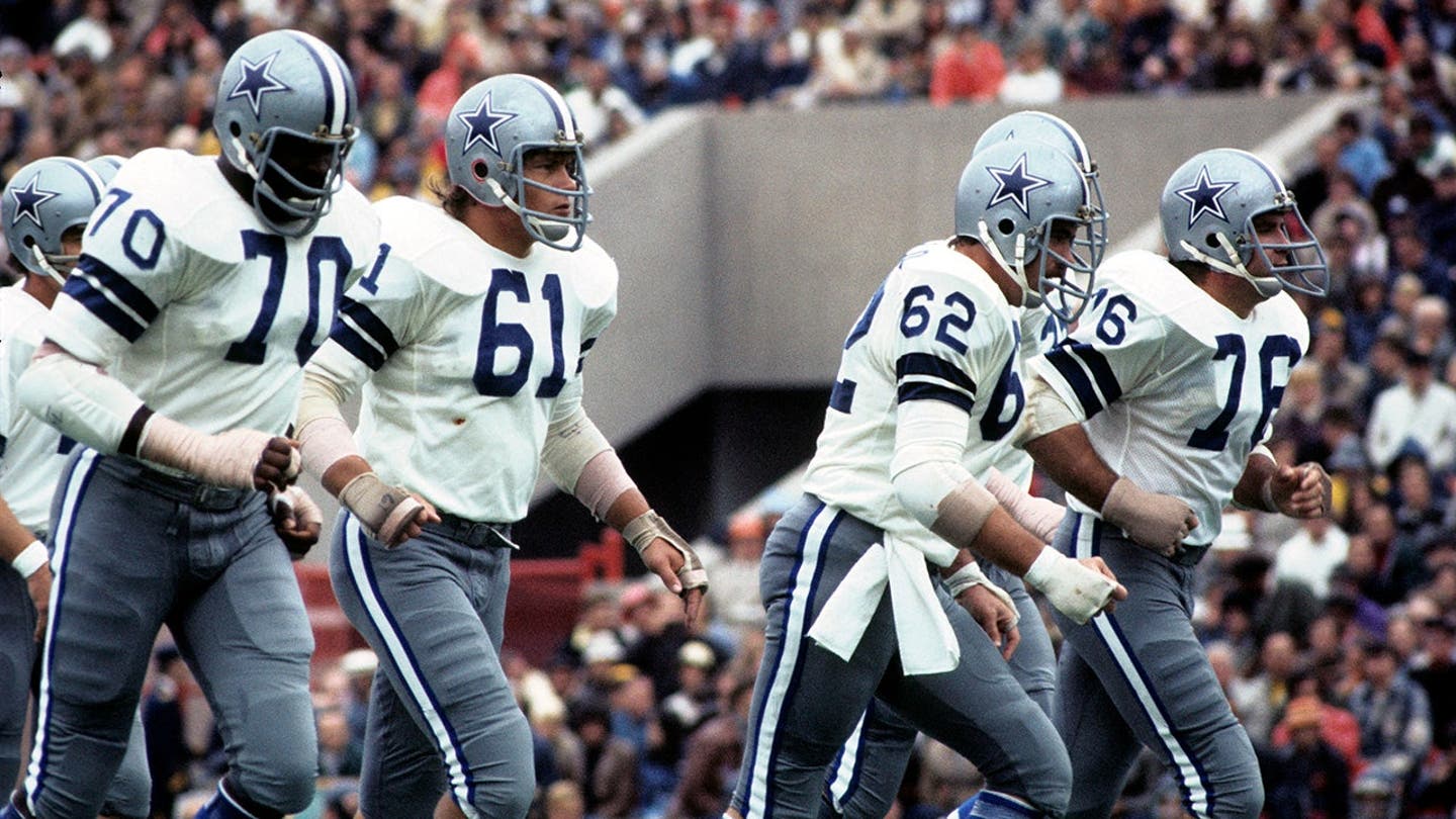 Dallas Cowboys offensive linemen Rayfield Wright, Blaine Nye, John Fitzgerald and John Niland run to the line of scrimmage during a game against the Chicago Bears at Soldier Field in Chicago, September 16, 1973. (Diamond Images/Getty Images)