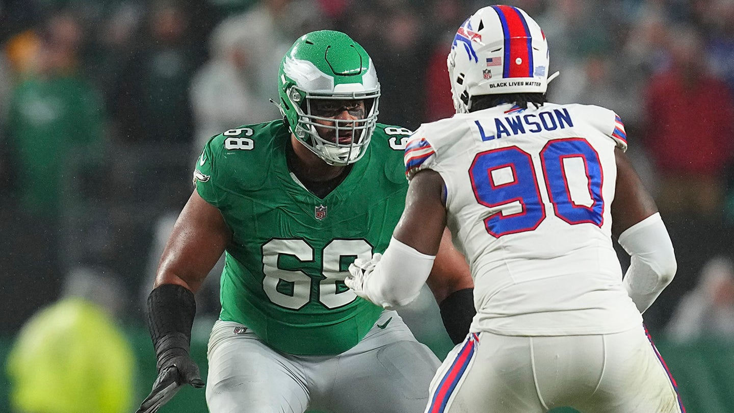 Jordan Mailata of the Eagles blocks Shaq Lawson of the Buffalo Bills at Lincoln Financial Field on November 26, 2023 in Philadelphia. (Mitchell Leff/Getty Images)