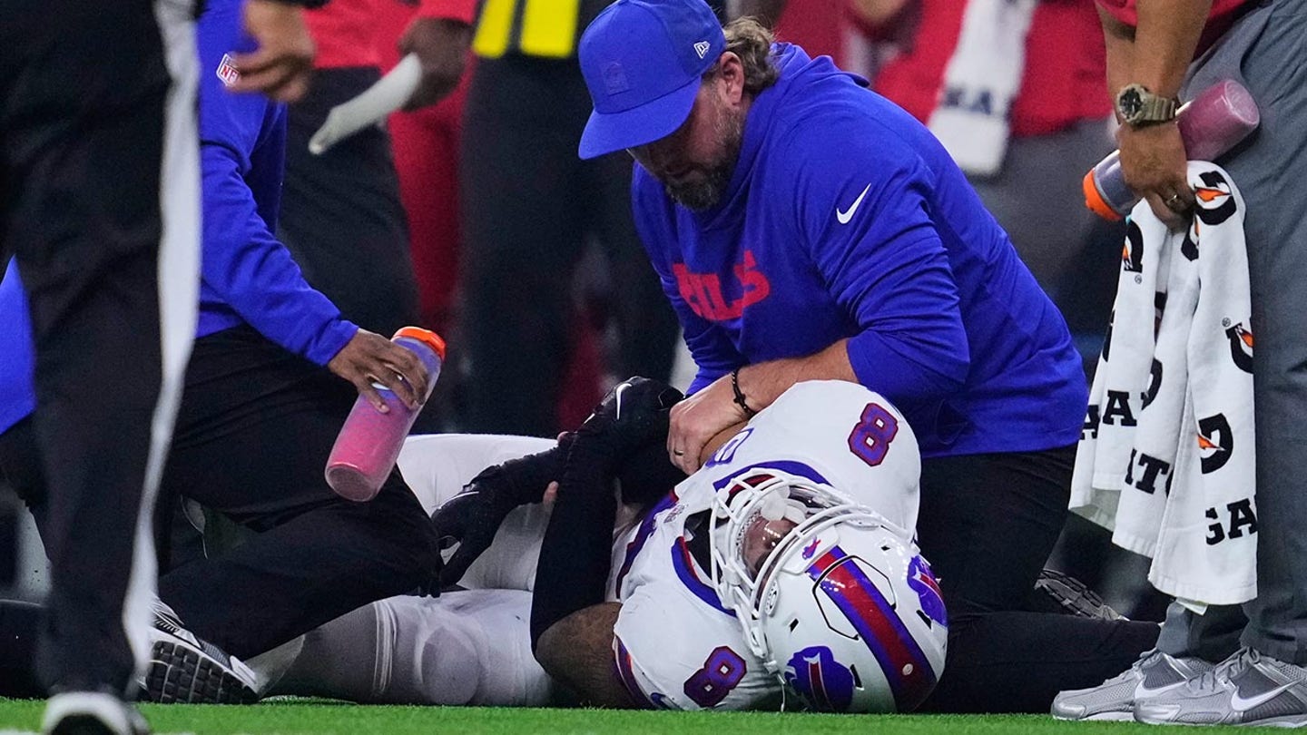 Buffalo Bills linebacker Terrel Bernard (8) is treated by medical staff after suffering an unknown injury in the second half of an NFL football game against the Houston Texans Thursday, Nov. 20, 2025, in Houston. (AP Photo/Ashley Landis)