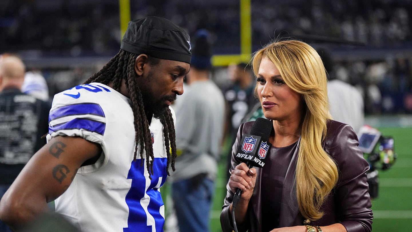 Jane Slater talks with TY Hilton of the Dallas Cowboys after the game against the Philadelphia Eagles at AT&T Stadium on December 24, 2022 in Arlington, Texas. (Cooper Neill/Getty Images)