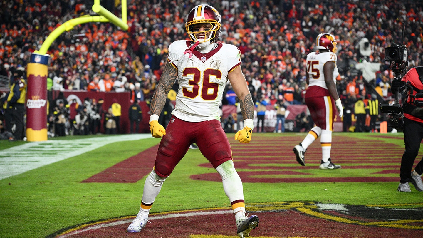 Washington Commanders running back Chris Rodriguez Jr. (36) celebrates after scoring during the first half of an NFL football game against the Denver Broncos on Sunday, Nov. 30, 2025, in Landover, Maryland. (AP Photo/Nick Wass)