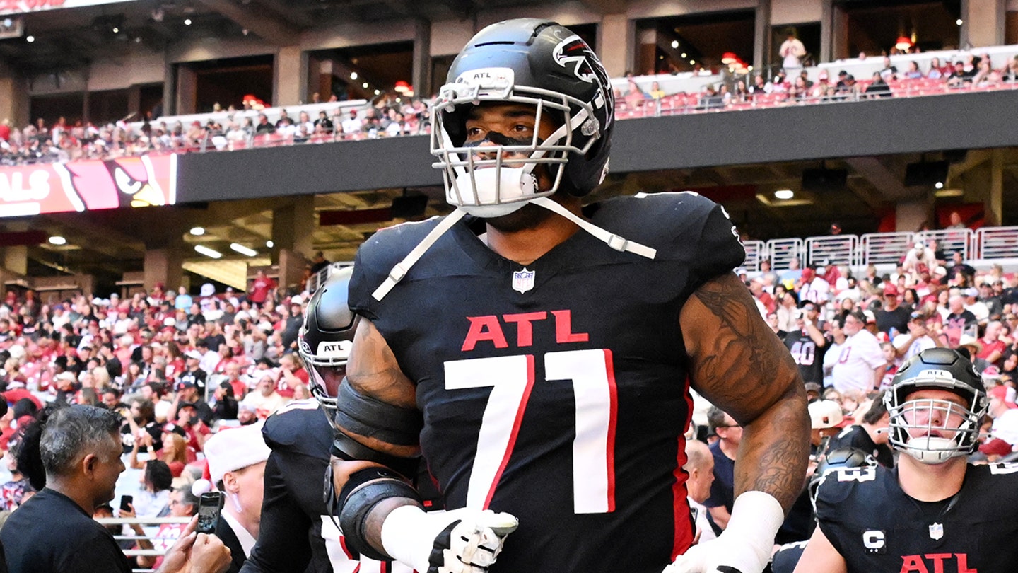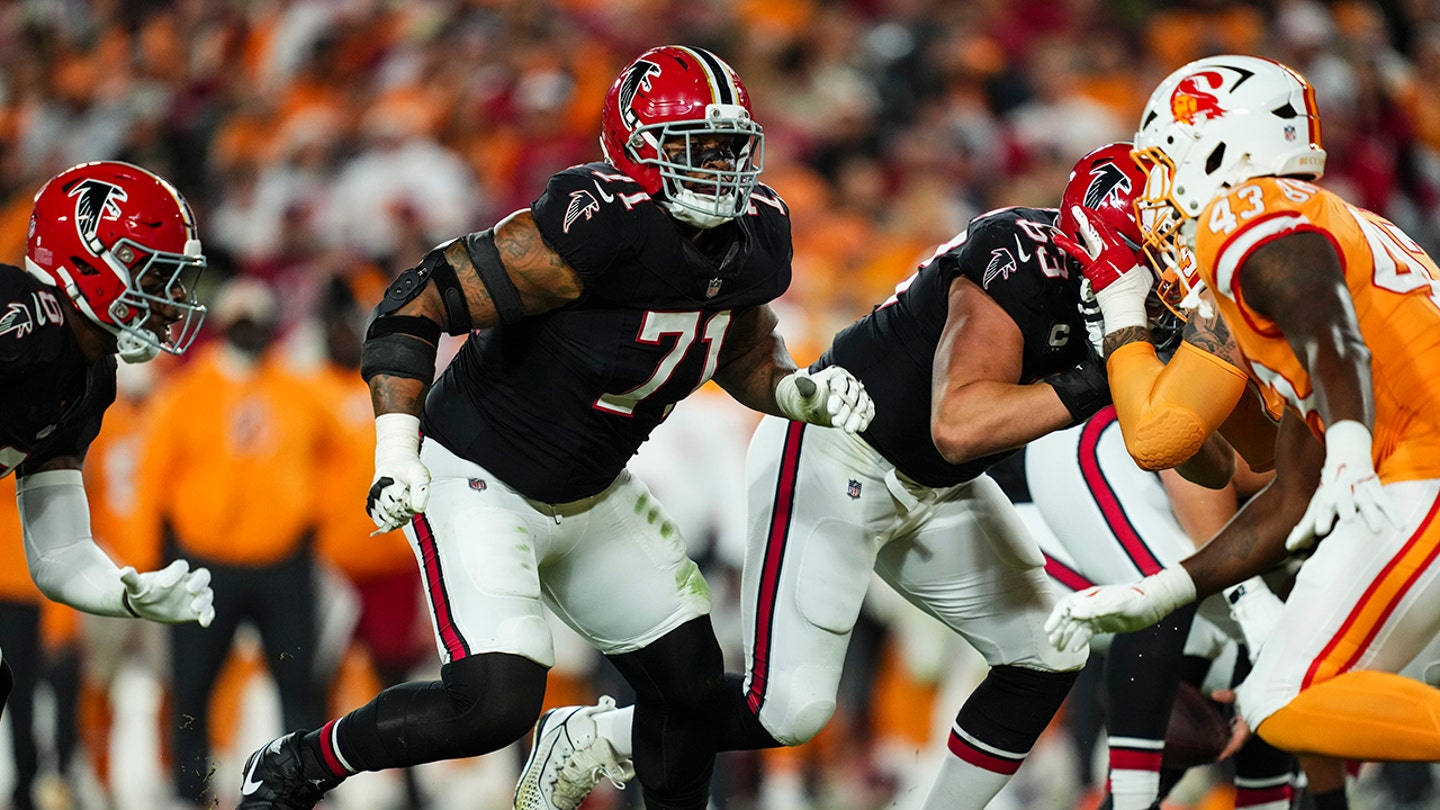 Atlanta offensive tackle Elijah Wilkinson reacts during a game against the Carolina Panthers on Nov. 16, 2025, at Mercedes-Benz Stadium in Atlanta. (Rich von Biberstein/Icon Sportswire)