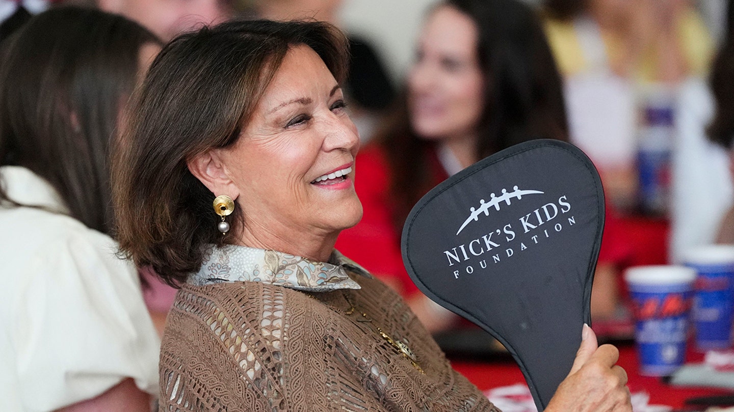 Terry Saban smiles as her husband, legendary football coach Nick Saban, explains how she “conspires” to spend money on the foundation’s business at the Nick’s Kids Foundation luncheon at Bryant-Denny Stadium on August 5, 2025. (Gary Cosby Jr./USA TODAY NETWORK via Imagn Images)