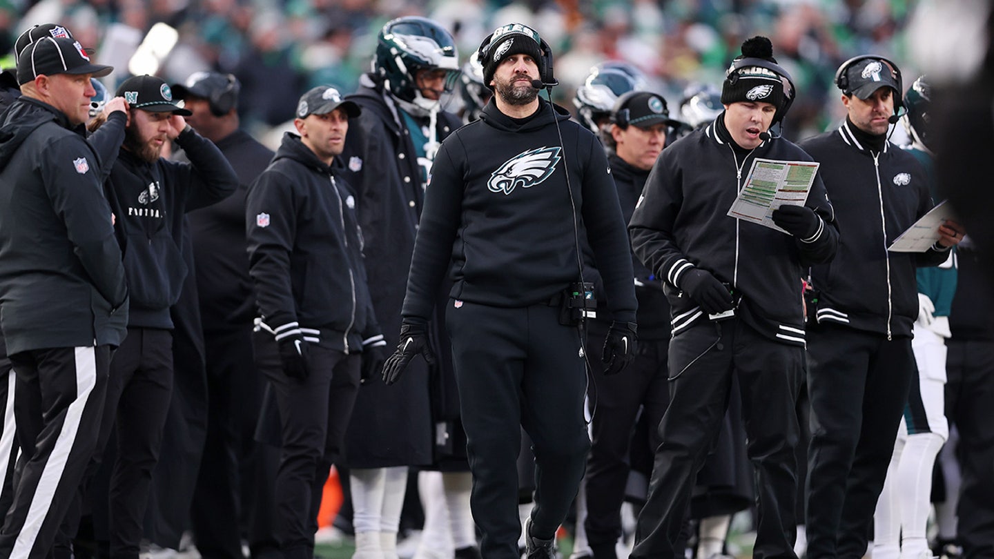 The Eagles of the Eagles of Philadelphia, Nick Sirianni, at the center, and the attacking coordinator Kellen Moore, on the right, during the first half of the NFC championship match at Lincoln Financial Field in Philadelphia on January 26, 2025. (Images Bill Streicher-Imagn)