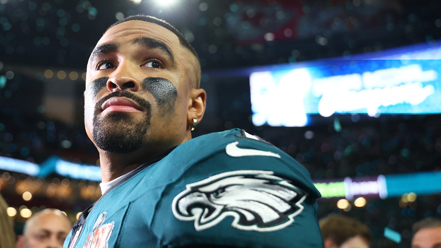 The quarter-arre of the Eagles of Philadelphia, Jalen Hurts, n ° 1, reacts on the field after having beaten the chiefs of Kansas City in the Super Bowl Lix with Superdome Superdome in New Orleans on February 9, 2025. (Images of Mark J. Rebilas-Imagn)