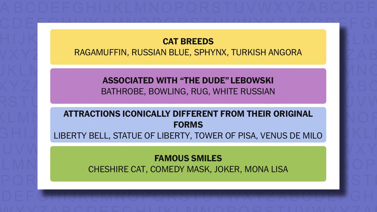 My mistakes did not end there, however. Despite the deduction of tourist attractions was a link, I tried to make a group containing Mona Lisa rather than Liberty Bell, confusion that I cannot help but suspect was part of the cunning plan today to confuse the players.