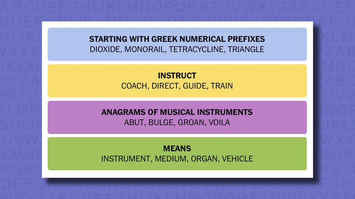 - Purple: Music instrument anagrams About, bulge, moaning, here