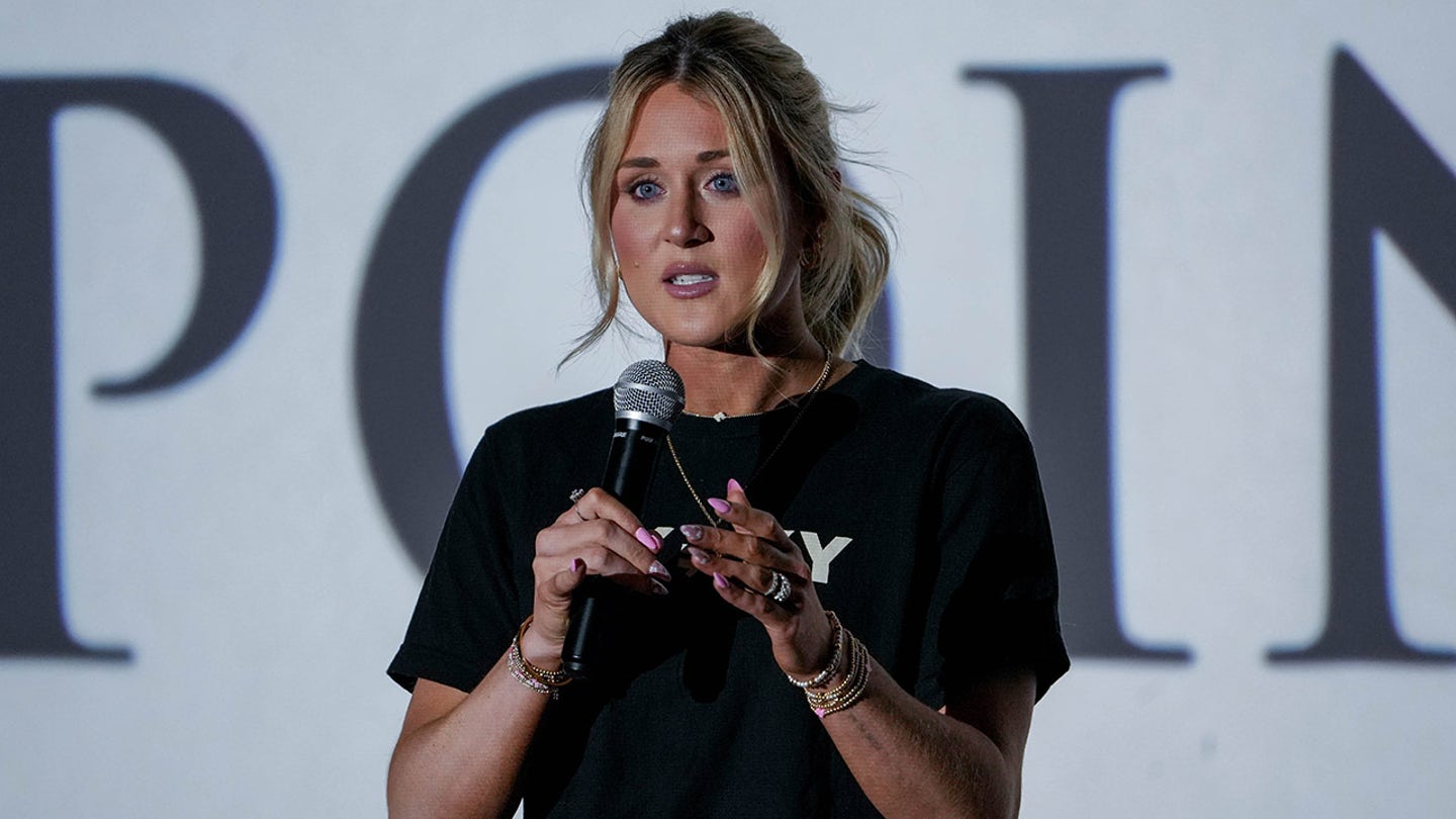 Riley Gaines speaks in an event of speech of the section of the University of Oklahoma Turning Point USA in Norman, Oklahoma, Wednesday April 2, 2025. (Nathan J. Fish / The Oklahoman / USA Today Network via Imagn Images)
