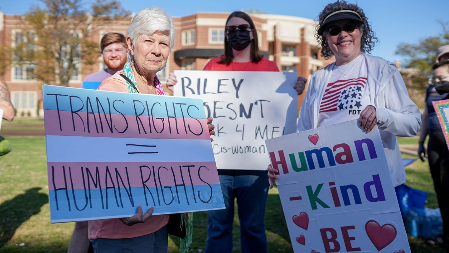 Kay Holladay holds a protesting sign against a speech event in the University of Oklahoma Turning Point USA for Riley Gaines in Norman, Oklahoma, Wednesday, April 2, 2025. (Nathan J. Fish / The Oklahoman / USA Today Network via Imagn Images)
