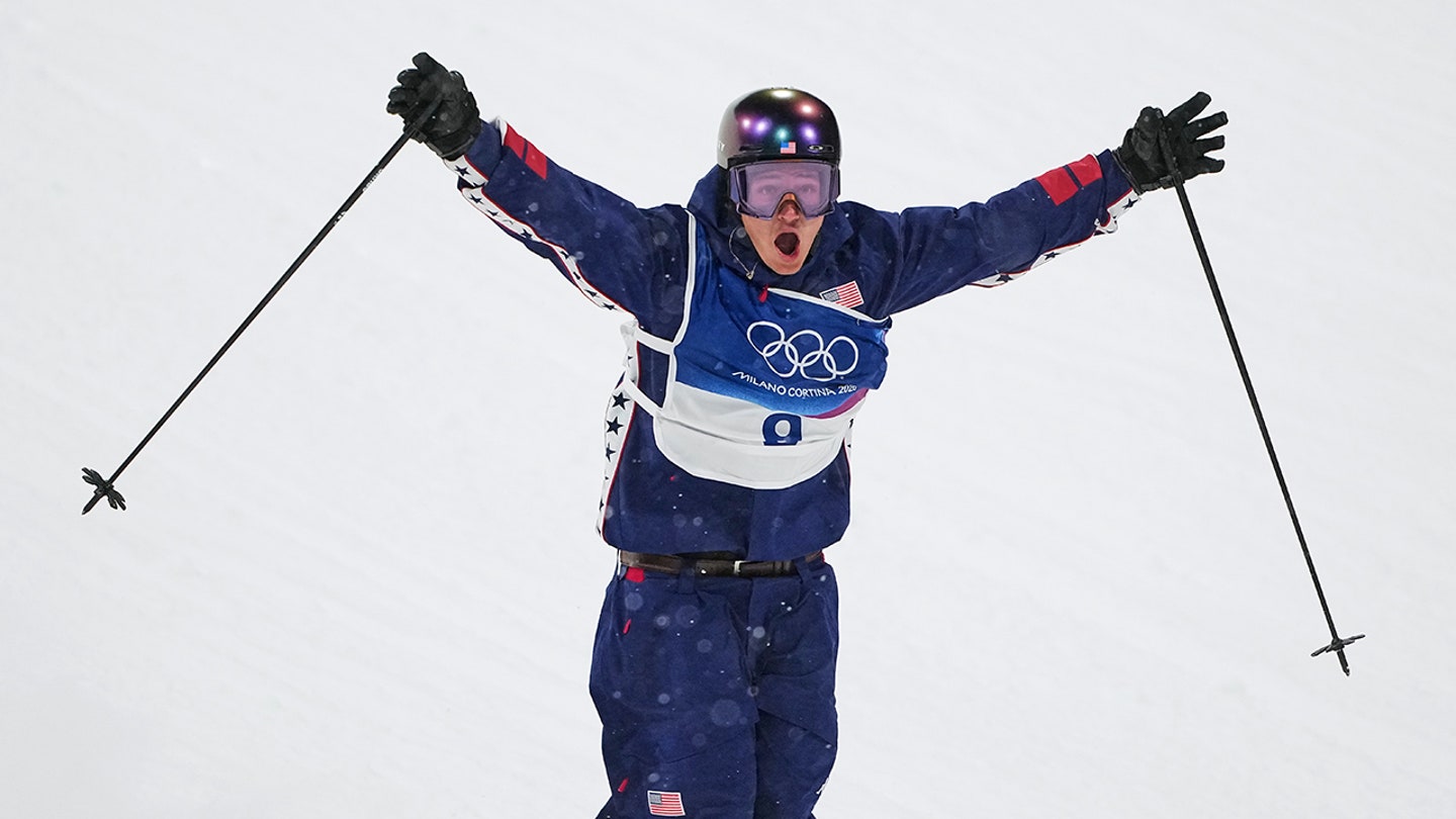 Mac Forehand of the United States celebrates during the men’s big air freestyle skiing finals at the 2026 Winter Olympics in Livigno, Italy, February 17, 2026. (AP Photo/Lindsey Wasson)