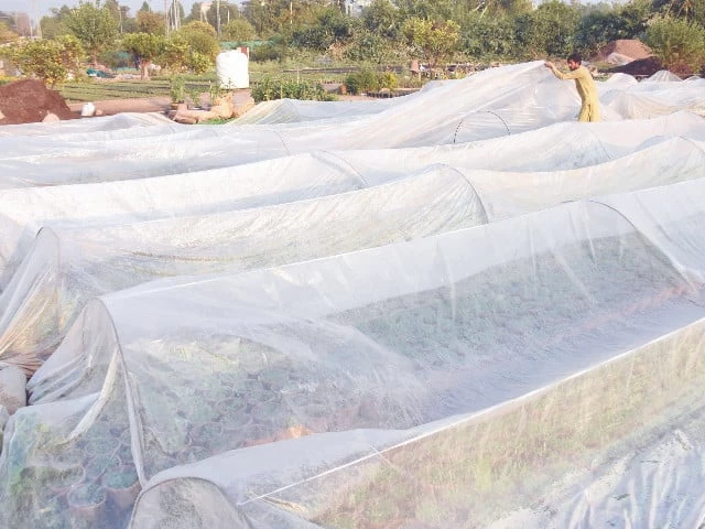 At a nursery in Islamabad, a gardener spreads a huge plastic blanket over frames containing newly sprouted saplings to protect the plants from the cold. Photo: ONLINE