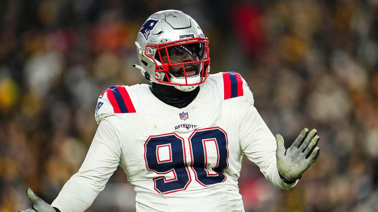 Christian Barmore of the New England Patriots reacts during an NFL football game against the Pittsburgh Steelers at Acrisure Stadium on December 7, 2023 in Pittsburgh, Pennsylvania. (Cooper Neill/Getty Images)