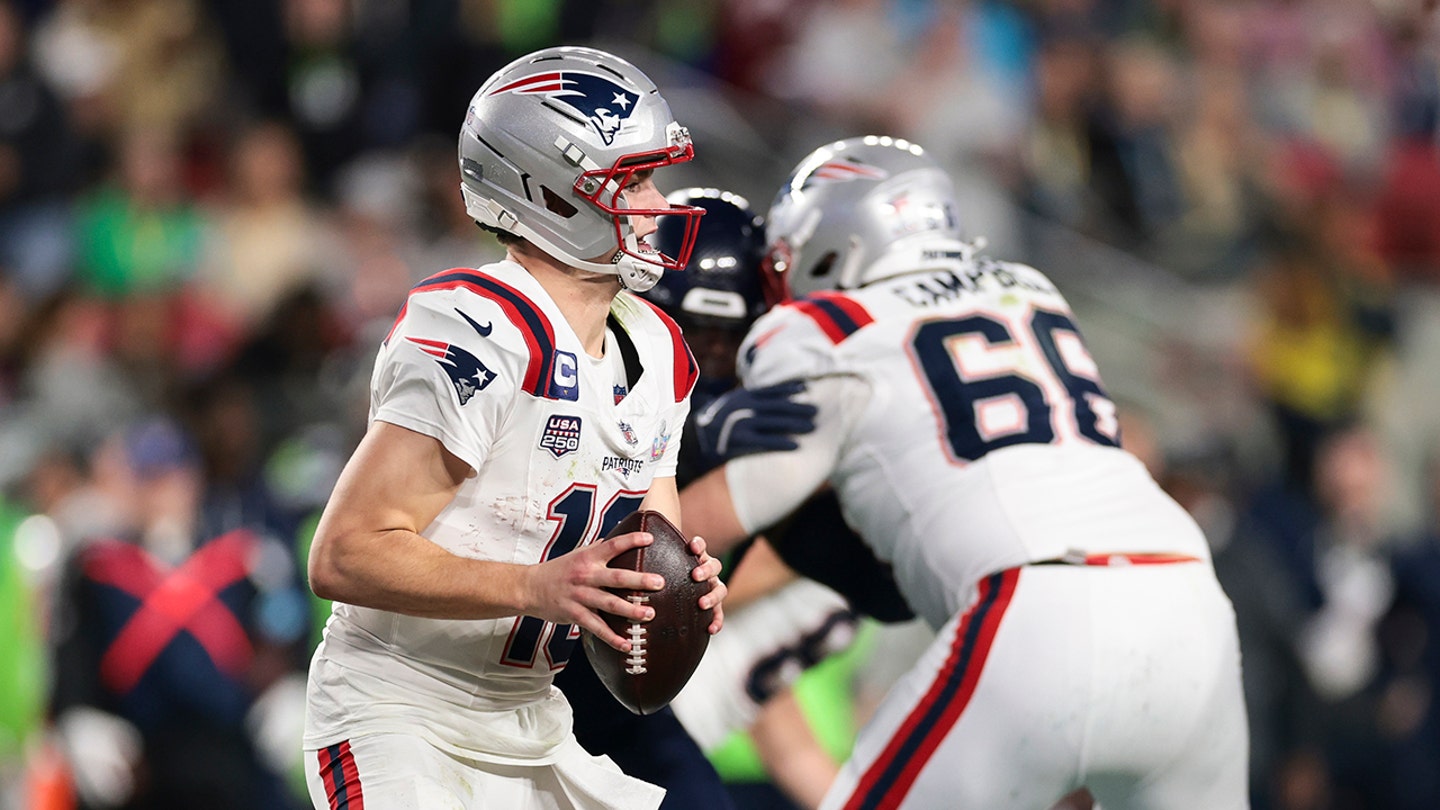 Drake Maye of the New England Patriots looks to pass as Will Campbell blocks against the Seattle Seahawks during the second half of Super Bowl LX at Levi’s Stadium on February 8, 2026 in Santa Clara, California. (Kathryn Riley/Getty Images)
