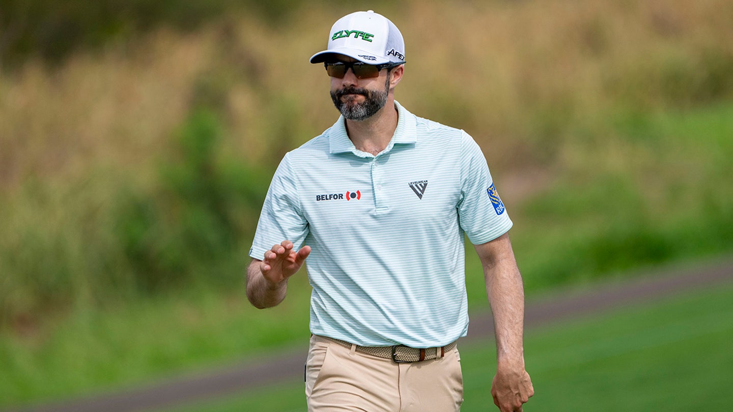 Adam Hadwin recognizes the crowd after doing his putt on the 12th hole in the third round of the Golf Sentry tournament on the plantation course in Kapalua in January 2025. (Images Kyle Terada-Imagn)