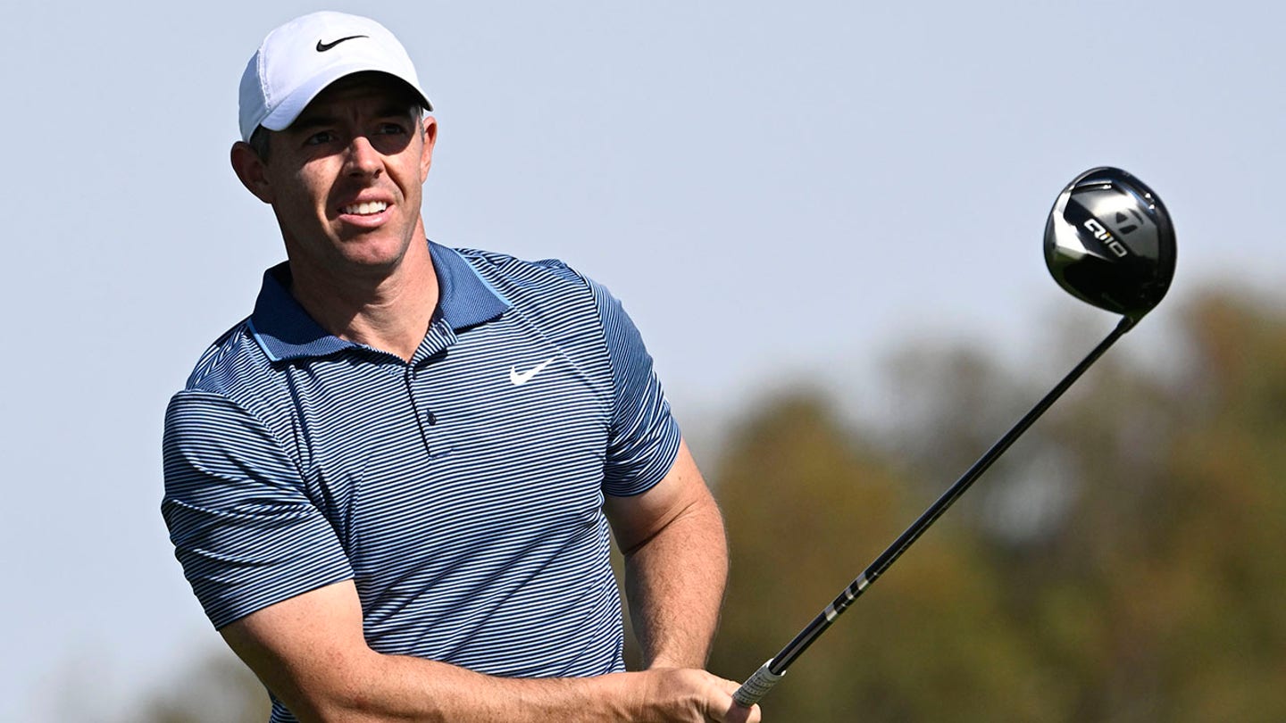 Rory McILroy hits his starting stroke during the last round of the Genesis Invitational. (Images of Denis Poroy-Imagn)