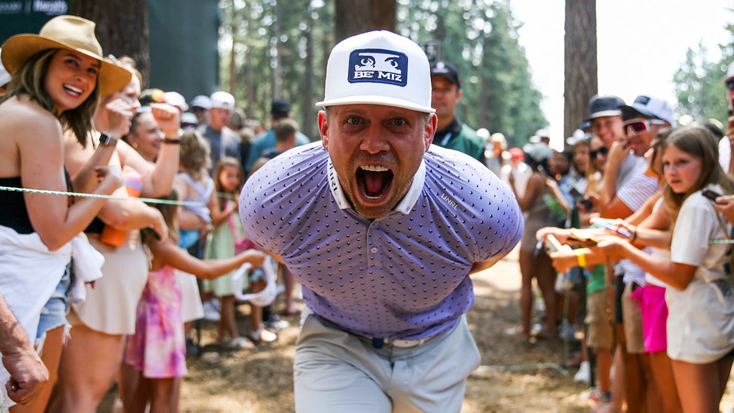 WWE wrestler, the MIZ reacts while walking around the 18th hole on the first day of the American Century 2024 championship at the Edgewood Tahoe Golf Race on July 12, 2024 in Stateline, Nevada. (Isaiah Vazquez / Getty Images)