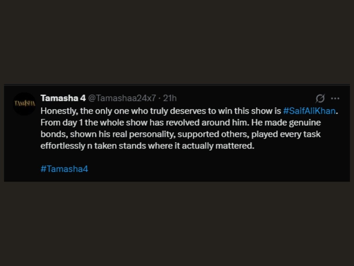 Another supported Saif’s alleged victory and wrote, “Honestly, the only one who really deserves to win this show is Saif Ali Khan. Since day one, the entire show has revolved around him. He made real connections, showed his true personality, supported others, accomplished every task effortlessly and took a stand where it actually mattered.”