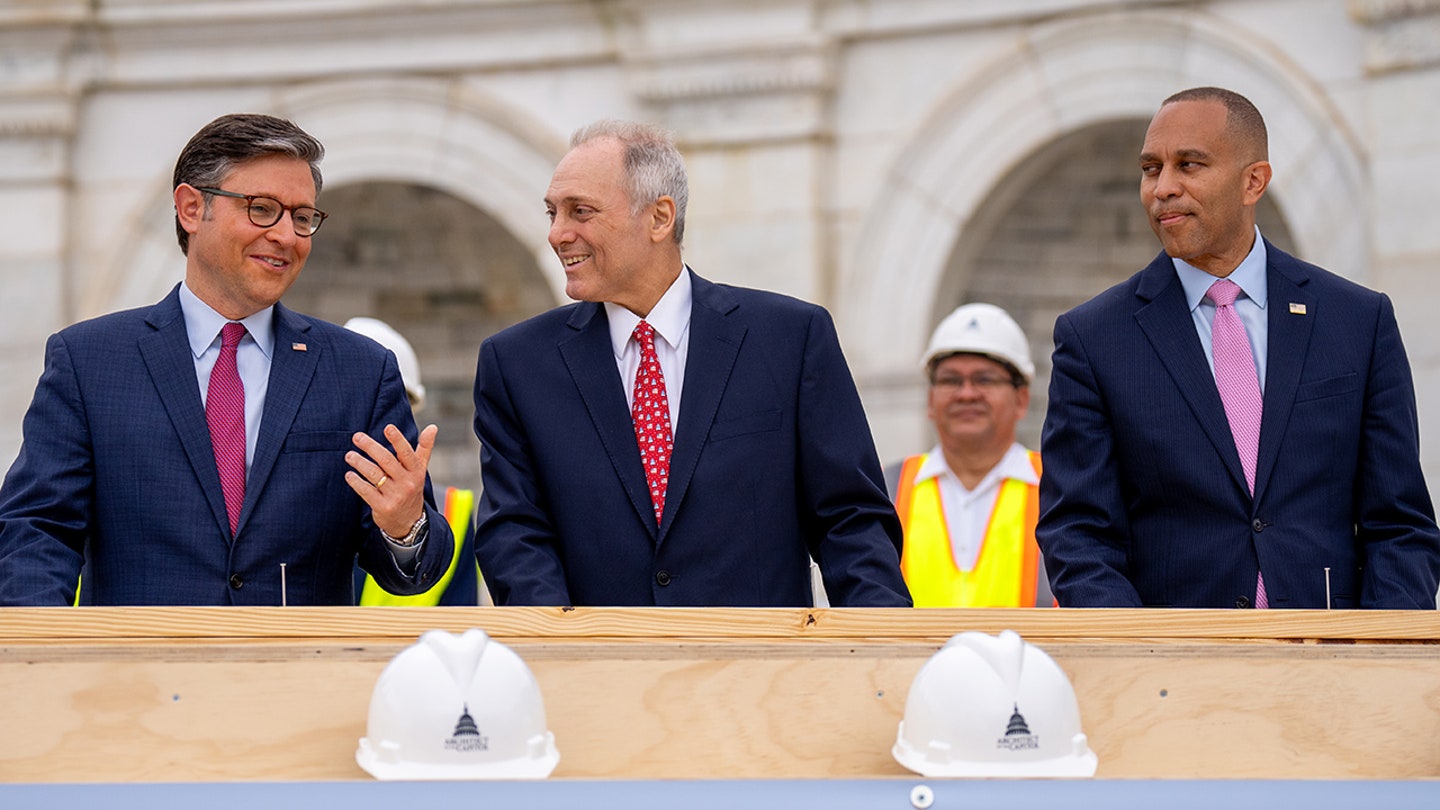 (L-R) House Speaker Mike Johnson (R-LA), House Majority Leader Steve Scalise (R-LA), and House Minority Leader Hakeem Jeffries (D-NY) participate in the groundbreaking ceremony for the construction of the 2025 Presidential Inauguration Deck on the West Front of the United States Capitol, September 18, 2024 in Washington, DC. (Andrew Harnik/Getty Images)