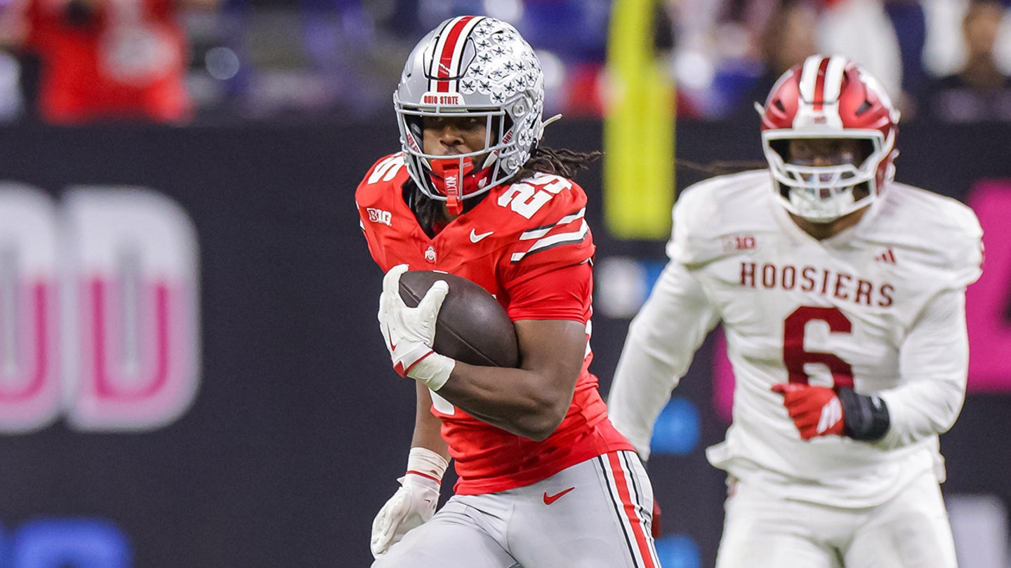 Bo Jackson #25 of the Ohio State Buckeyes runs the ball against the Indiana Hoosiers during the 2025 Big Ten Championship game at Lucas Oil Stadium on December 6, 2025 in Indianapolis, Indiana. (Michael Hickey/Getty Images)