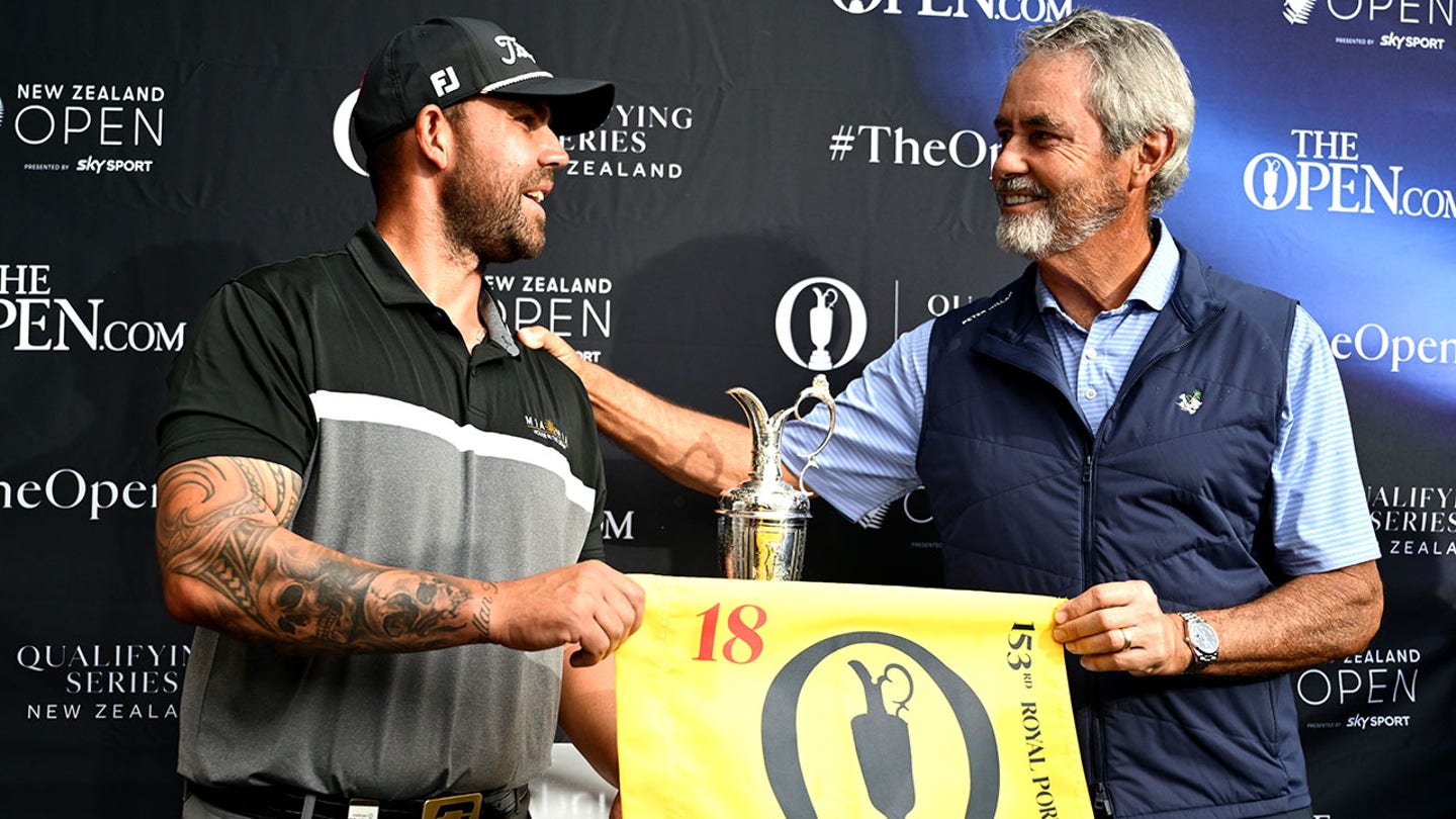 Former winner of the open championship Ian Baker-Finch congratulates Ryan Peake of Australia after winning New Zealand 2025 open, qualifying him for the next championship open to Millbrook Resort on March 2, 2025, in Queenstown, New Zealand. (Hannah Peters / Getty Images)
