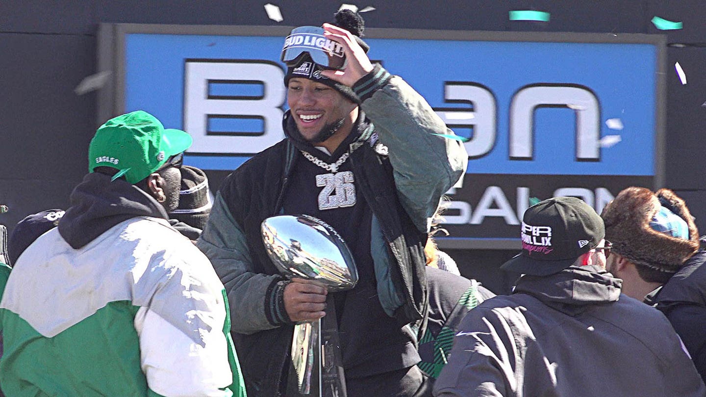The Eagles Running Back Saquon Barkley, center, holds the Vince Lombardi trophy during the parade of the Eagles Super Bowl Championship on Friday, February 14, 2025. (Damian Viletto / Delaware News Journal / USA Today Network via Imagn Images)