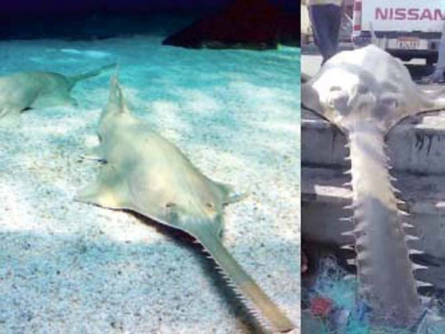 Endangered Longcomb sawfish caught off the coast of Jiwani are found on the pier. A photo of the fish available on the Internet shows a pair in an aquarium. Photos: Express/file
